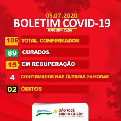 Por tanto, o município conta com: 106 casos confirmados, 89 recuperados e 2 óbitos.