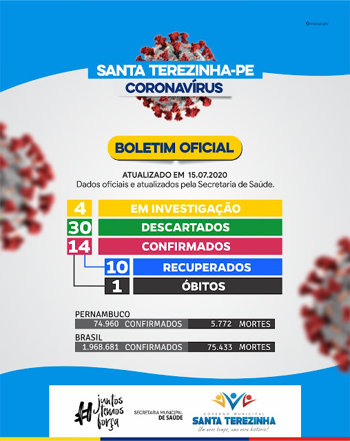 O município também soma quatorze (14) casos confirmados do Covid-19, com dez (10) curas, ou seja, ainda tem quatro (4) pessoas que lutam contra a doença para se recuperar.