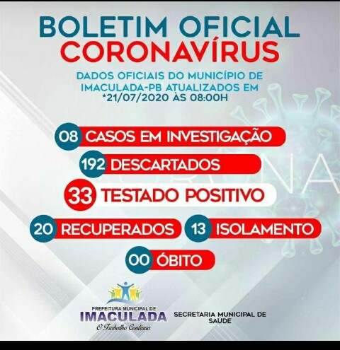 Nas últimas 24 horas Imaculada registrou mais dois (2) novos casos do Covid-19, chegando a trinta e três (33) até esta terça-feira, 21 de julho. Os casos de recuperação pararam em 20 e já foram descartados 192 suspeitas. Ainda a 13 pessoas em isolamento e mais oito (8) casos em investigação.