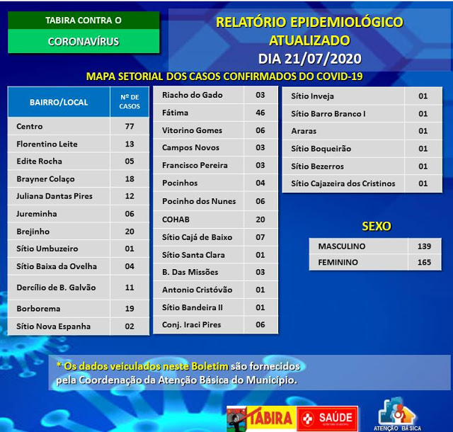 O número de casos confirmados do Covid-19 em Tabira chega a ser surpreendente. No Boletim Oficial dessa terça-feira, 21 de julho o município anunciou que já passou dos trezentos (casos) que deram positivo para a nova cepa do Coronavírus. Uma boa notícia é que os casos de recuperação também têm o número bem elevado.