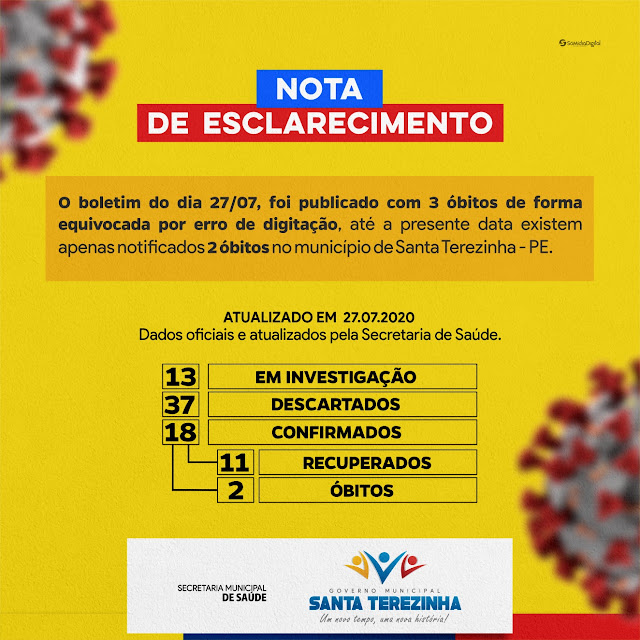 O Setor de Saúde de Santa Terezinha emitiu nota nesta terça-feira, 28 de julho esclarecendo que houve um erro de digitação no Boletim Oficial do Covid-19 publicado ontem (27) no número de óbitos (mortes) causadas pela doença na área do município.