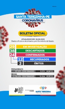 Nesse domingo, 2 de agosto houve um novo caso colocado sob suspeita do Covid-19 em Santa Terezinha e também um novo caso confirmado. Agora o município soma 24 casos confirmados por teste rápido ou por Swab. No momento são vinte e nove (29) em investigação, trinta e oito (38) descartados, doze (12) recuperados e dois (2) óbitos.