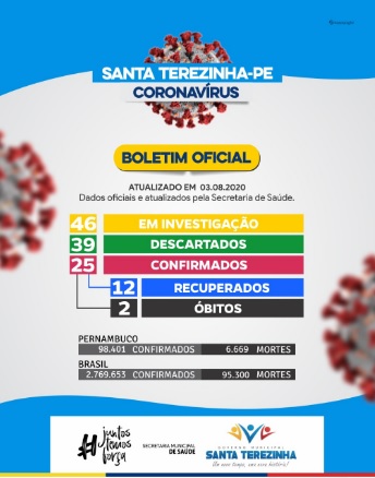 Em 24 horas os casos em investigação para o Covid-19 em Santa Terezinha subiram de vinte e nove (29) para quarenta e seis (46). Os dezessete (17) novos casos colocados sob investigação foram confirmados na noite dessa segunda-feira, 3 de agosto em Boletim da Secretaria de Saúde, que além disto, ainda informou um novo caso confirmado para o Coronavírus.