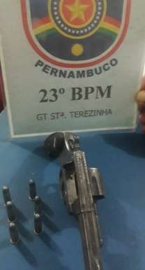 Nesse domingo, 9 de agosto a polícia militar estava atuando em Santa Terezinha e atendia uma ocorrência de perturbação do sossego com descumprimento do Decreto Estadual do Covid-19 e com o apoio do Policial Civil de plantão, após denúncia anônima, foram até o Sítio Macacos e localizaram enterrada em um pátio de eventos, em uma chácara, uma arma de fogo da marca TAURUS calibre 32″ com seis (6) munições intactas, não sendo identificado o proprietário.