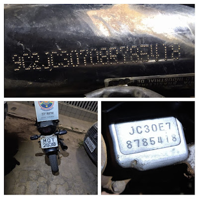 Foi feita uma outra consulta pelo NIS-BEPI, através do sistema INFOCEG, e constatou-se tratar de uma moto roubada, uma Honda Fan 125, cor preta, placa NPU 1584 de Patos-PB, ano 2008.
