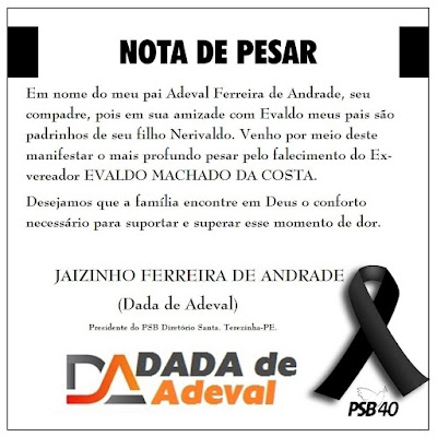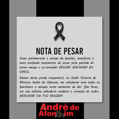 “Vai nos fazer uma grande falta! Que Deus te receba na morada celestial meu grande amigo e ex vereador Evaldo Machado. Aos familiares ficam nossas condolências do prefeito Vanin de Danda e do vereador Neguim de Danda”.