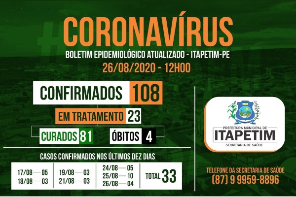 Nas ultimas 24 horas, a Secretaria de Saúde de Itapetim confirmou quatro casos positivos para a COVID-19. Do total, três foram através do teste rápido e um pelo RT PCR através da rede de laboratórios particulares.