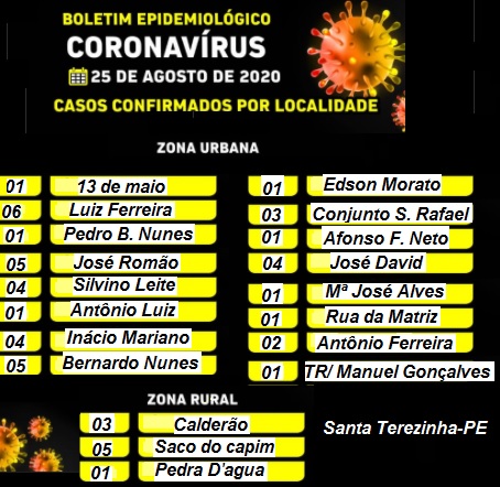 De acordo com levantamento do setor de epidemiologia do município, a Rua Luiz Ferreira de Andrade lidera o número de casos confirmados, seis (6) seguida das ruas José Romão de Araújo e Bernardo Nunes, cada uma com cinco (5).