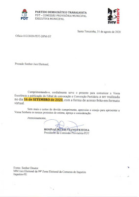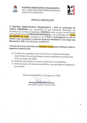 O Partido Democrático Trabalhista (PDT) através de seu diretório municipal em Santa Terezinha informou nesta quarta-feira, 2 de setembro que sua convenção para confirmação de candidaturas será no dia 16 de setembro.