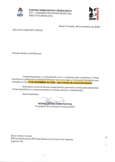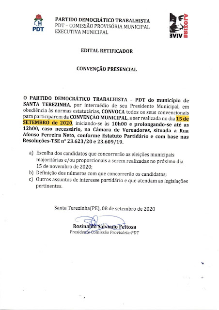 O PDT em Santa Terezinha mudou a data de sua convenção partidária que aconteceria no dia 16 deste mês de forma virtual. A nova data definida é 15 de setembro às 10hrs da manhã e a mudança foi justificada para que se tenha acesso presencial na homologação das candidaturas a prefeito, vice e vereadores.