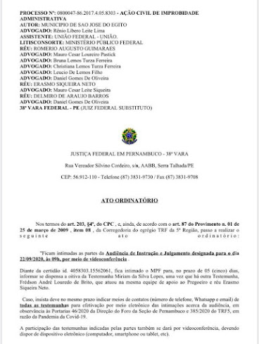 Acontece hoje às nove horas por videoconferência a Audiência de Instrução do processo 0800047-86.2017.4.05.8303 da Ação Civil de Improbidade movida pela gestão Evandro Valadares contra o ex-prefeito Romério Guimarães.