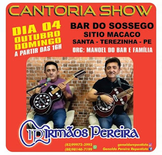 No próximo domingo, 4 de outubro o Bar do Sossego no Sítio Macacos, zona rural de Santa Terezinha estará promovendo uma grande cantoria a partir das 16hrs com os Irmãos Pereira. Manoel do Bar e família aguarda todos que gostam de uma boa cantoria de repente e boas canções.