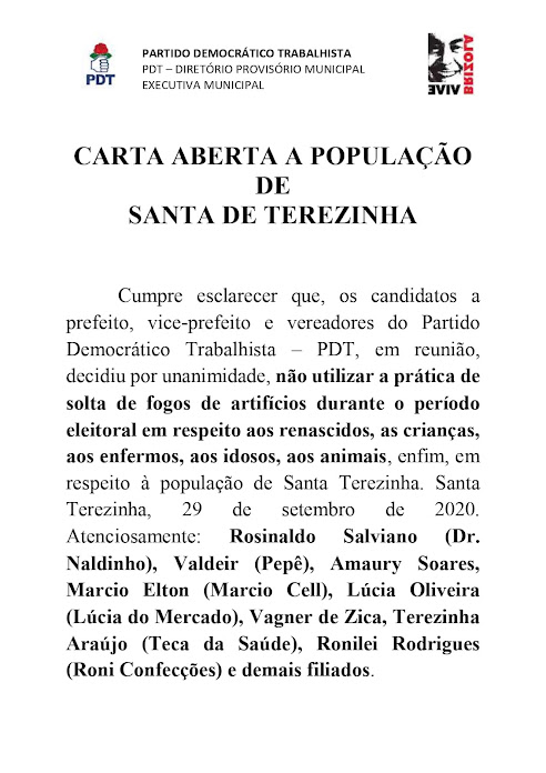 O Partido Democrático Trabalhista (PDT) em Santa Terezinha comandado por Dr. Naldinho Salviano está defendendo um período eleitoral sem ruídos e respeitando o distanciamento social. A chapa do PDT não vai causar poluição sonora ou interferir no silêncio ambiental com uso de fogos de artifício.