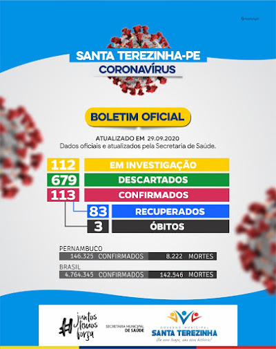 Nas últimas 24hrs Santa Terezinha não registrou nenhum novo caso confirmado de Covid-19 continuando com 113 pessoas que contraíram o Novo Coronavírus. Cinco (5) casos foram colocados sob investigação somando 112 e os casos descartados continuam em 679.