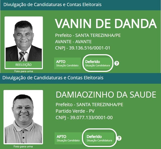 A Justiça Eleitoral já deferiu duas candidaturas a prefeito para as eleições deste ano na Terrinha Santa. A 1ª foi do candidato a reeleição Vaninho de Danda (Avante) e agora confirmou a de Damiãozinho da Saúde (PV). Faltando 30 dias para o pleito, nenhum dos 33 candidatos a vereadores (as) tiveram suas candidaturas confirmadas pela justiça.
