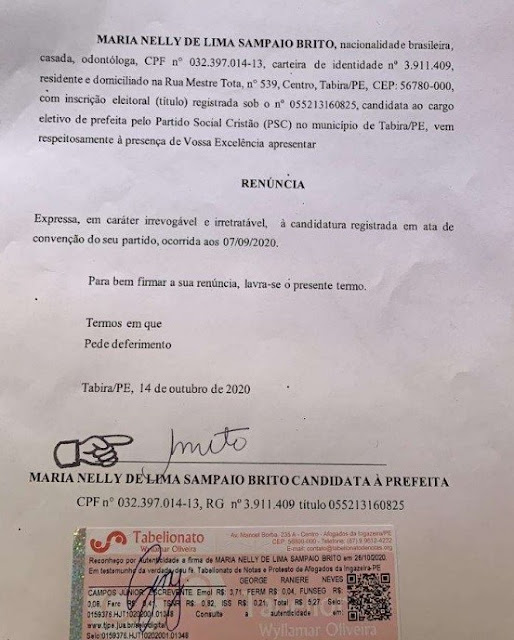 Já havia desistido de fato, não de direito. A notícia da retirada da candidatura de Nelly explodiu no blog em 14 de outubro. Ela havia definido ser candidata a vice de Dinca Brandino.