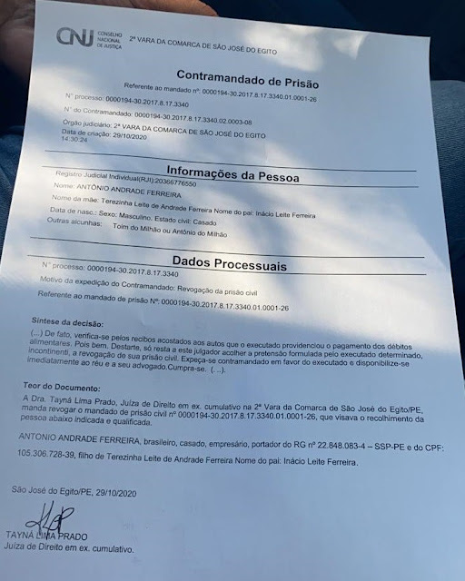 A bem da verdade, sobre matéria veiculada em blog acerca de mandado de prisão contra o vereador Antônio Andrade Ferreira, candidato a vice-prefeito pela Coligação Muda São José, faz-se necessário esclarecer que houve precipitação na emissão do documento e exagerado erro quanto à divulgação do mesmo. Antes de justificarmos, informamos que já foi emitido contramandado (n. 0000194-30.2017.8.17.3340.02.0003-08) revogando a prisão civil.