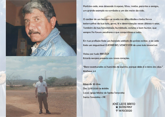A família do saudoso José Leite Brito, enlutada pelo sua partida para junto de Deus, comunica que a missa de 30º dia em sufrágio de sua alma será neste domingo, 22 de novembro às 8 horas da manhã na Igreja Matriz de Santa Terezinha.