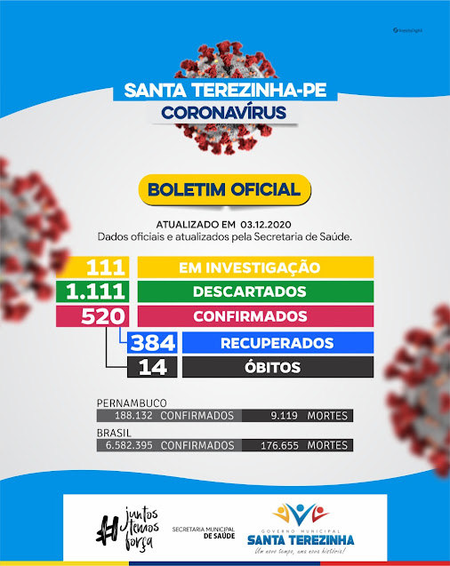 No boletim referente ao dia 3 de dezembro Santa Terezinha passou a contar com 520 casos confirmados de Covid-16, sendo mais 4 novos casos confirmados. O número de casos investigados permaneceu em 111 e o número de casos descartados subiu em 4, totalizando 1.111. A soma dos casos de pessoas recuperadas permaneceu em 384 mas o número de óbitos subiu para 14.