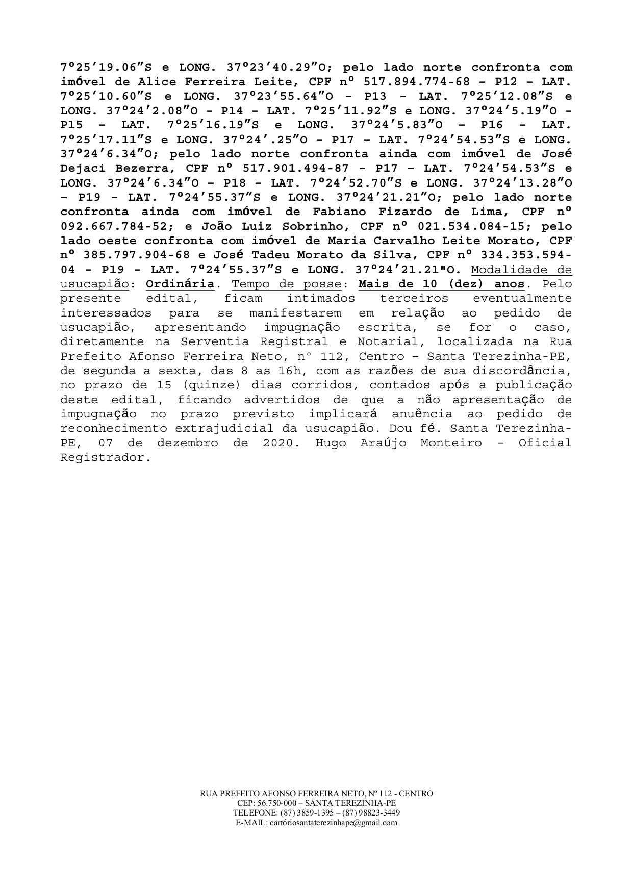 Santa Terezinha – Edital Extrajudicial de Usocapião. Notícias Por Blog do Pereira.Net Publicado em 8 de dezembro de 2020 Ultima atualização 1 de fevereiro de 2022 0 162 Compartilhado O edital é para se tornar público a ação vista logo à baixo. DestaquesSanta Terezinhauso capião 0 162 Compartilhado FacebookWhatsAppTelegram