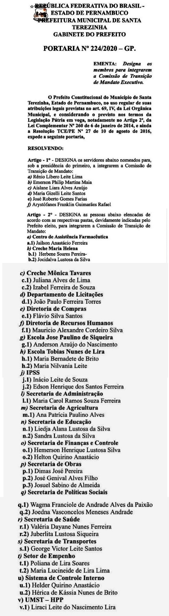 O prefeito em exercício de Santa Terezinha Adarivan Santos e o prefeito eleito Delson Lustosa já nomearam as pessoas para formar a equipe de transição de governo, responsável por diagnosticar como está o quadro real da prefeitura, para que o próximo gestor tenha base para começar seus trabalhos.
