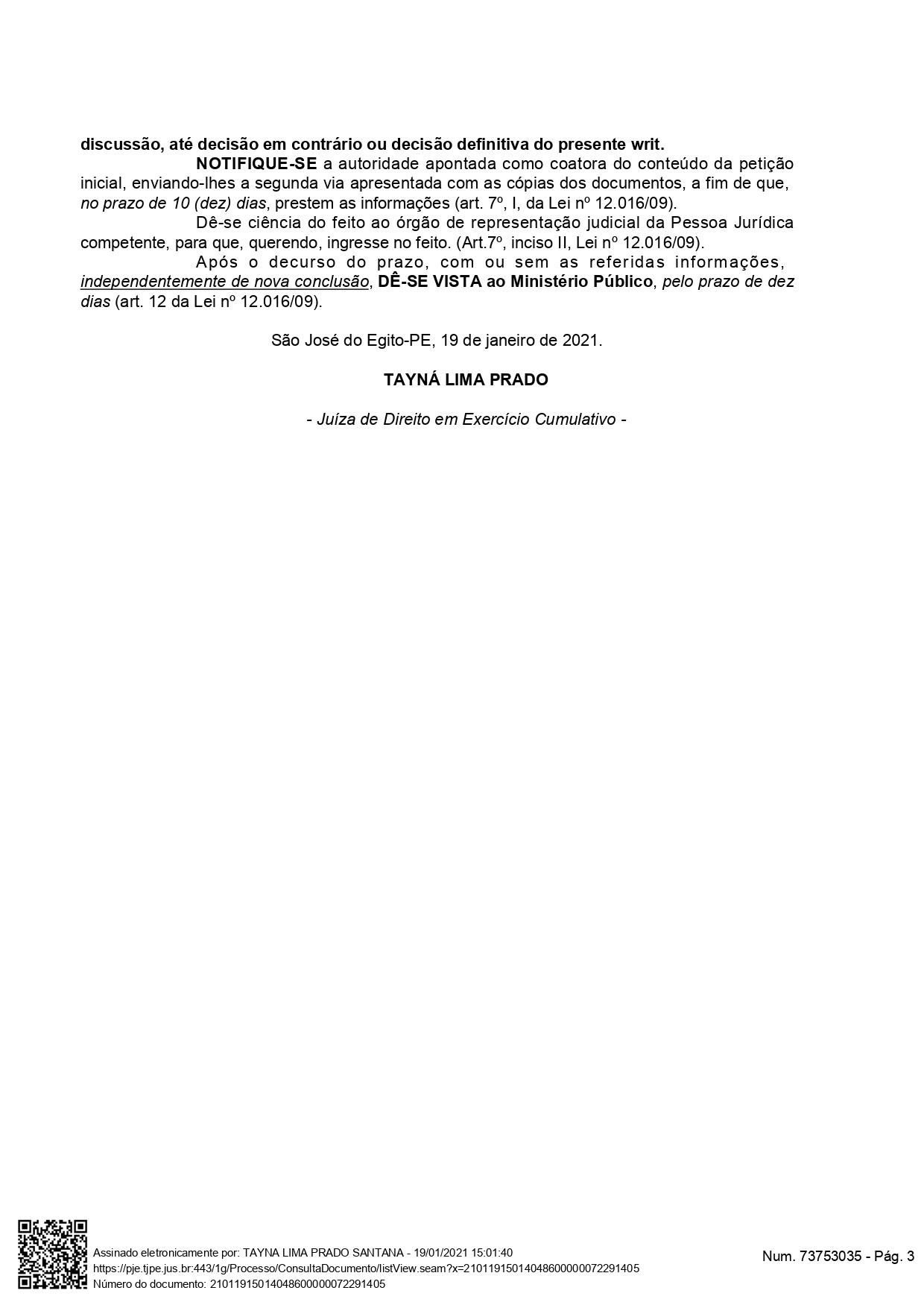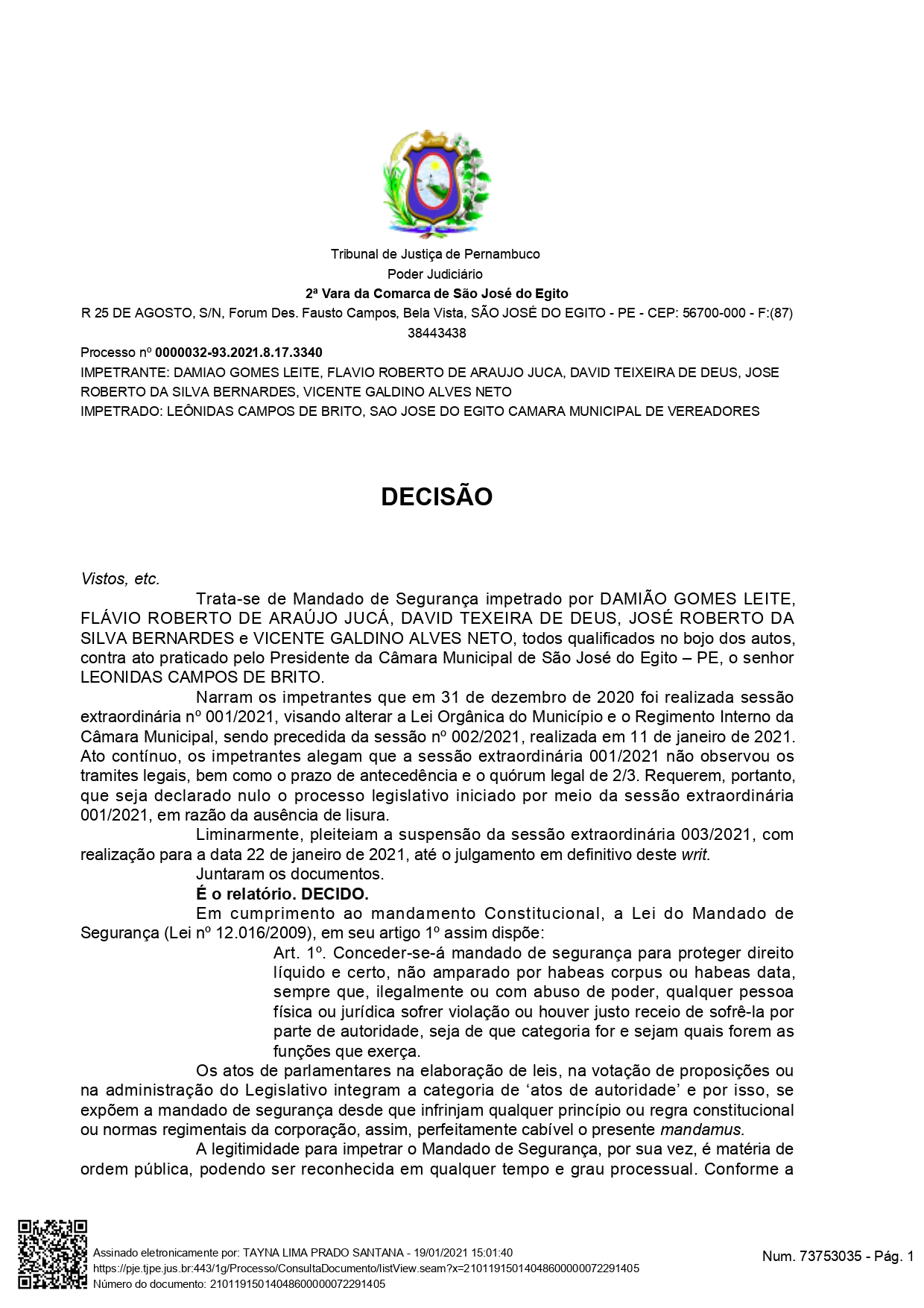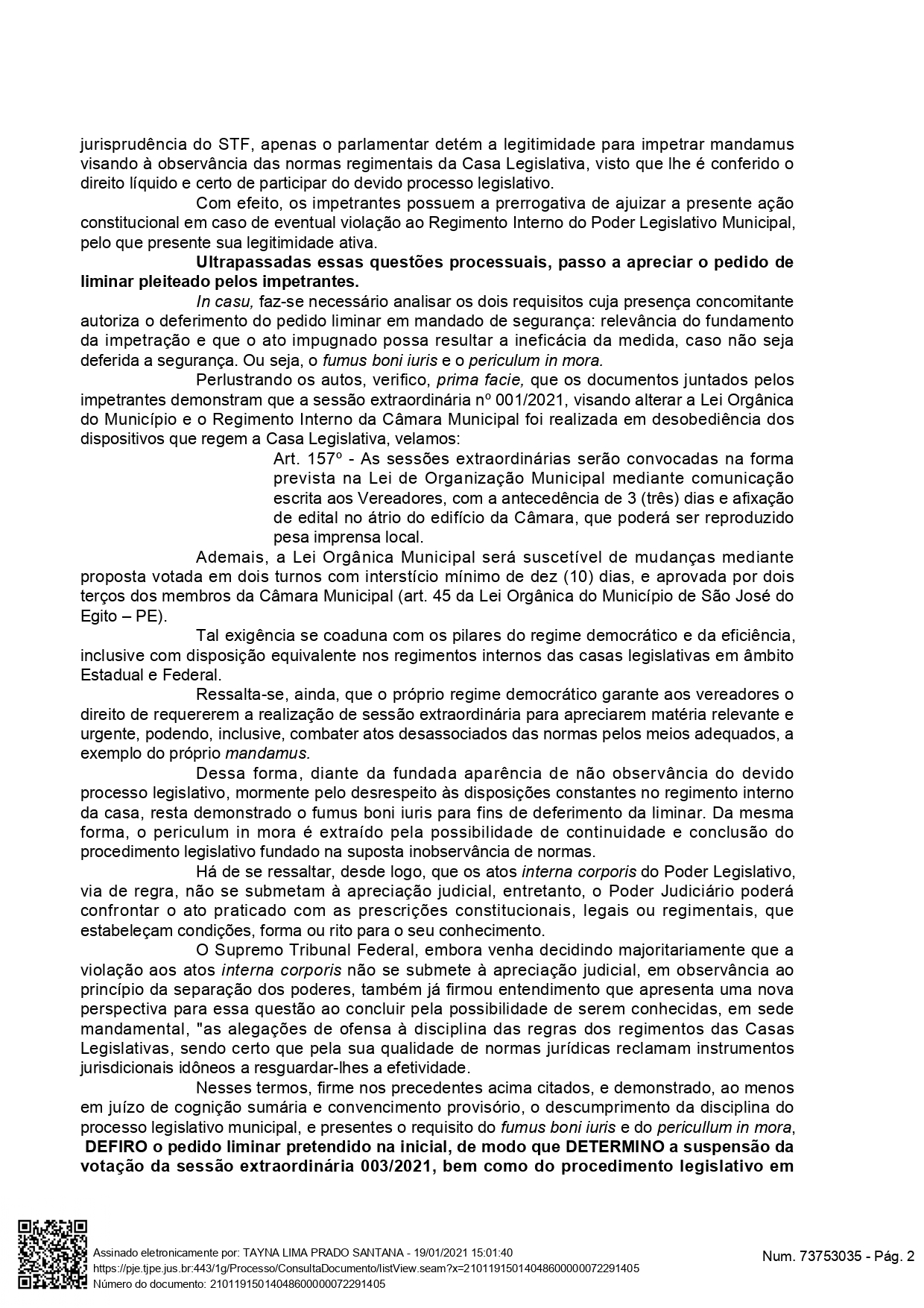 Assim,  demonstrado o descumprimento da disciplina do processo legislativo municipal, deferiu o pedido,  determinando a suspensão da votação da sessão extraordinária 003/2021, bem como do procedimento legislativo em discussão, até decisão em contrário ou decisão definitiva.