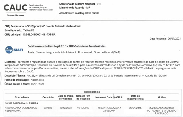 Após seis anos, Tabira finalmente sai da lista de inadimplentes do CAUC.