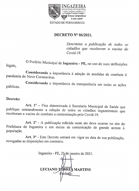 É a primeira cidade do Pajeú a determinar a publicidade da lista. Até então a única notícia era de que algumas secretarias por conta própria sem decreto estavam divulgando os números dos vacinados, sem nominar.