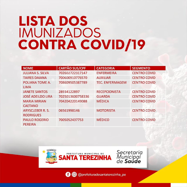 Para garantir transparência no processo de vacinação contra o Covid-19 a prefeitura de Santa Terezinha divulgou a relação de pessoas imunizadas contra o Novo Coronavírus. A lista está disponível no Instagram do governo municipal e segue o modelo implantado em outros municípios para que a população tenha tranquilidade quanto as prioridades da vacina.