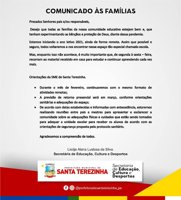 A secretaria de educação Terezinhense comunicou na noite dessa sexta-feira, 5 de fevereiro que está iniciando o ano letivo de 2021, mas ainda de forma remota e pede que que de segunda a sexta-feira, os alunos usem o material escolar recebido para estudar em casa.
