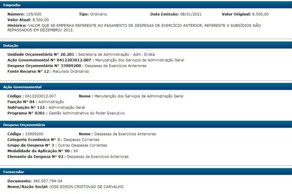 De acordo com informações de importante fonte da política tabirense já no dia 8 de janeiro, quatro dias após sentar na cadeira de prefeita, já que iniciou os trabalhos no dia 4 de janeiro de 2021, a prefeita de Tabira, Maria Claudenice Pereira de Melo, autorizou por meio da Nota de Empenho nº 105/000, o pagamento de R$ 8.500,00 ao seu esposo, José Edson Cristóvão de Carvalho, portador do CPF nº 340.507.794-04.