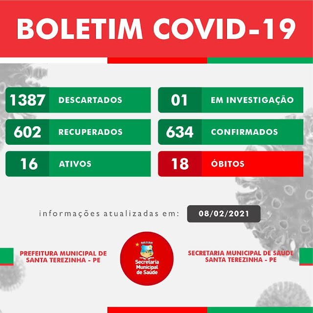 Santa Terezinha já soma 18 mortes causadas pelo Novo Coronavírus ou por complicações causadas por ele. A informação está no boletim da secretaria de saúde do município divulgado nessa segunda-feira, 8 de fevereiro. São 16 casos ativos e mais um que está sob observação. O município já conta com 634 casos confirmados do Covid-19 e já descartou 1.387.