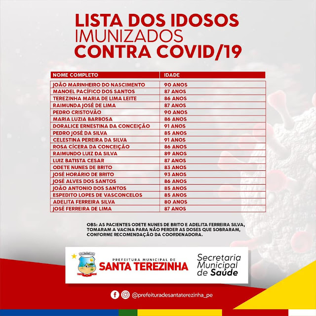 Nesta terça-feira (16) a secretaria de saúde divulgou o nome dos idosos de 85 anos ou mais que receberam a dose da vacina na comunidade da Lagoa do Mizael.
