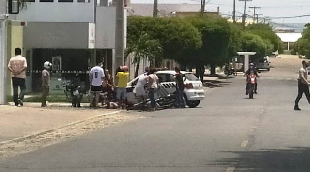 Um acidente ocorrido por volta do meio-dia desta quarta-feira, dia 10, na Rua Moacir Leitão, em frente da Delegacia de Polícia Civil, Bairro Belo Horizonte, em Patos, deixou duas pessoas feridas após a colisão envolvendo carro e moto.