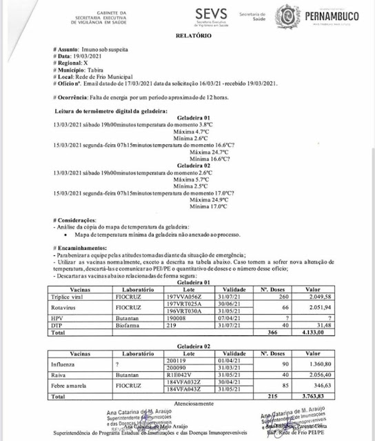 O laudo não apresenta a quantidade de doses de vacina contra o coronavírus foram testadas, mas orienta: “caso tornem a sofrer nova alteração de temperatura, descartá-las e comunicar ao PEI/PE o quantitativo de doses”. O Blog do Magno revelou que foram 330 doses.