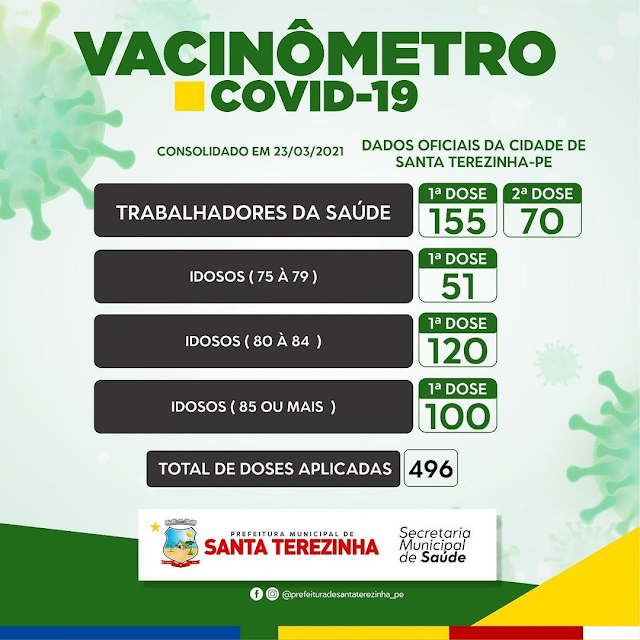 De acordo com a secretaria de saúde de Santa Terezinha foram aplicadas até esta terça-feira (23.03) 496 doses da vacina contra a Covid-19 para uma população de cerca de 12 mil habitantes, ou seja, o trabalho está andando. Quem recebeu mais doses até o momento são os profissionais de saúde que entre a 1ª e a 2º aplicação, já receberam 225 doses.