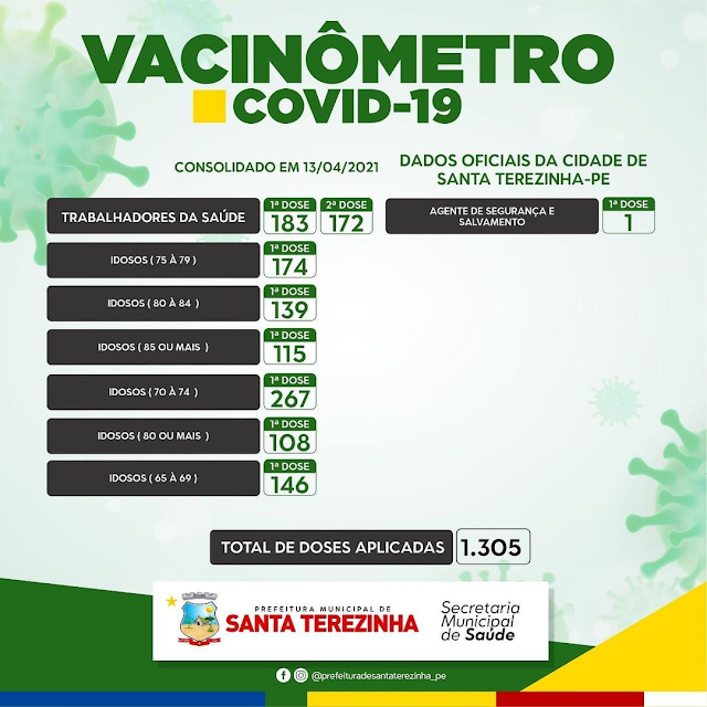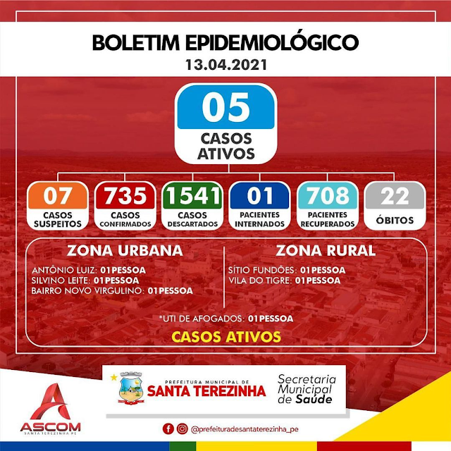 Em boletim divulgado nessa terça-feira, 13 de abril a Secretaria de Saúde de Santa Terezinha confirmou cinco (5) casos ativos de Covid-19, sendo que um paciente segue internado na UTI do Emília Câmara de Afogados da Ingazeira. Das cinco pessoas infectadas, três moram na zona urbana, uma na Rua Antônio Luiz, uma na Silvino Leite e outra no Bairro Novo Virgulino. Dois pacientes residem na zona rural, um so Sítio Fundões e outro na Vila do Tigre.