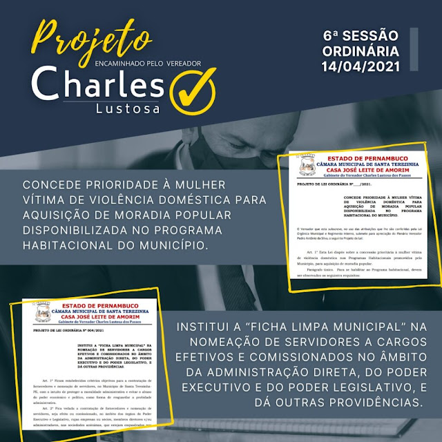 O vereador de Santa Terezinha Charles Lustosa (Podemos) encaminhou as comissões da Câmara de Vereadores dois projetos de lei na sessão ordinária dessa quarta-feira (14.04). Além daquele projeto que concede prioridade a mulheres vítimas de violência para aquisição de moradia popular, disponibilizada no programa habitacional do município, já adiantado pelo blog, outro projeto foi apresentado.