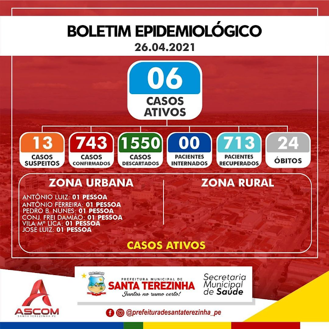 Santa Terezinha continua com seis casos ativos de Covid-19 no momento e todos são da zona urbana. Mais quatro casos foram descartados e o número de suspeitos diminuiu para treze. A cidade segue sem nem um paciente internado para tratar do Novo Coronavírus e os números permanecem estáveis nos últimos três dias.