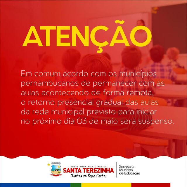 Em comunicado nesta quinta-feira, 29 de abril a Secretaria de Educação de Santa Terezinha informou que a volta das aulas presenciais foram suspensas. Estava previsto o regresso delas para a próxima segunda-feira, dia 03 de maio, porém, o setor informou que em comum acordo com os municípios pernambucanos as aulas vão permanecer de forma remota para os alunos.