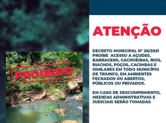 A Prefeitura de Triunfo, publicou o decreto nº 028/21, que proíbe o acesso público a açudes, barragens, cachoeiras, rios, riachos, poços, cacimbas e similares no âmbito do município. A informação foi divulgada no Instagram oficial da Prefeitura neste domingo (02.05).