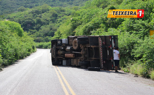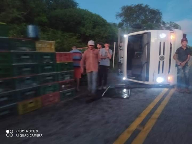 Ninguém se feriu no acidente. O motorista e outro colega aguardam a chegada do guincho para retirada do caminhão.
