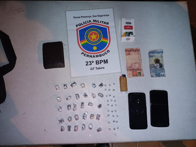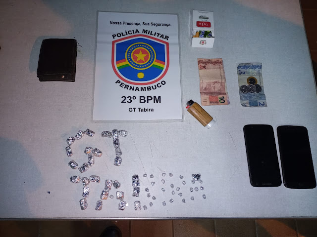 Por volta das 21h30min dessa sexta-feira, 07 de maio a GT Ordinária de Tabira e a Rocam, quando realizavam rondas e abordagens, visualizaram dois homens andando em atitude suspeita, ao ser feita a busca pessoal foi encontrado no bolso do short de um deles trinta (30) dólares de maconha, pesando 27,6 gramas e vinte e nove (29) pedras de crack, pesando 3,7 gramas, também foi encontrado um celular LG K10, IMEI 35772407046912 e outro da marca Moto G4 Play, IMEI 35413607812913, bem como a quantia R$17,50 em dinheiro.