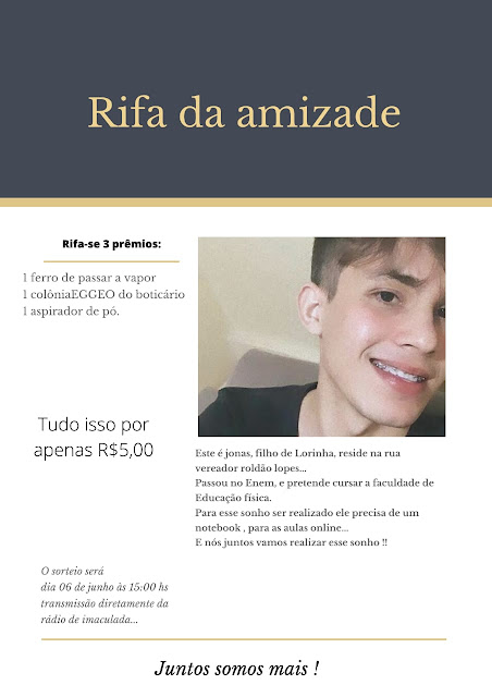 O jovem Imaculandese Jonas, filho de Dona Lourinha passou no ENEM e pretende cursar Educação Física. Para realizar seu sonho, o rapaz precisa de um notebook para assistir as aulas online, então os amigos resolveram colaborar fazendo uma ‘Rifa da Amizade’ com três prêmios, um ferro a vapor, uma colônia EGGEO do boticário e um aspirador de pó, tudo isso por apenas R$ 5.00.
