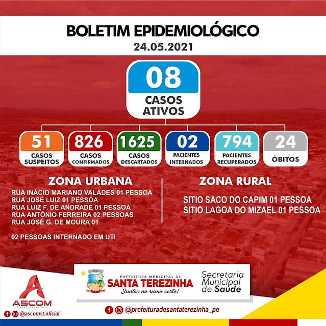 De acordo com o boletim do setor de saúde de Santa Terezinha divulgado nessa segunda-feira, 24 de maio o município conta no momento com oito (08) casos ativos de Covid-19, seis (06) na cidade e dois (02) na área rural, mas soma 51 casos sob investigação, o que pode elevar o número de pessoas infectadas pelo Novo Coronavírus nos próximos dias.
