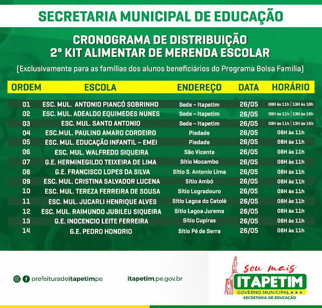 O Governo de Itapetim através da Secretaria de Educação está entregando nesta quarta-feira (26.05) a segunda remessa dos kits de merenda escolar 2021 para os alunos beneficiários do Bolsa Família. A entrega será feita conforme cronograma divulgado pela Secretaria de Educação.