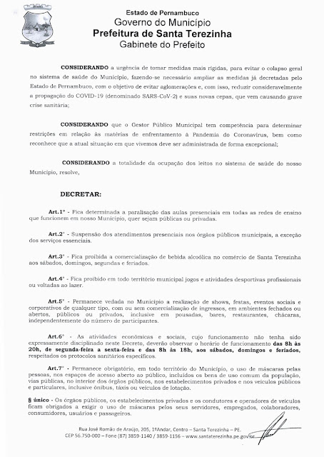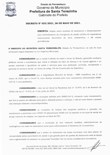 Foi publicado na manhã desta quinta-feira, 27 de maio um novo decreto em Santa Terezinha que trata de medidas mais rígidas de isolamento e distanciamento social de enfrentamento ao Coronavírus. O decreto considera que o nível de isolamento está bem baixo na Terrinha Santa, as condições de lotação dos hospitais e o perigo iminente de capso no sistema de saúde.