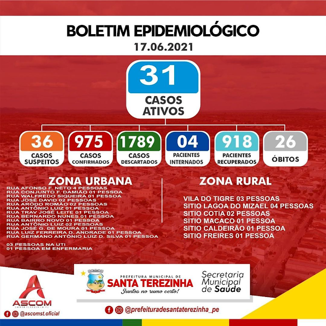 Nas últimas 24 horas surgiram mais sete (7) casos ativos de Covid em Santa Terezinha. O município também registrou mais sete (7) casos confirmados e mais uma internação na UTI. Dos novos casos confirmados quatro (4) moram na cidade e três na zona rural. Vinte e duas (22) casos de Coronavírus foram descartados.