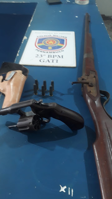 O policiamento chegando ao local, encontrou o suspeito que seria o proprietário do armamento, o qual confirmou a veracidade da denúncia e entregou uma espingarda artesanal sem qualquer identificação, também um revólver Taurus oxidado, numeração de série 5227496, com seis munições ogival intactas que pertencia a um outro envolvido, que reside na cidade de São José do Egito.