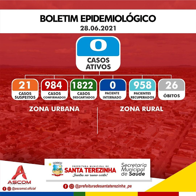 A secretaria de saúde de Santa Terezinha voltou a atualizar os números dos casos de Covid-19 na área do município nesta segunda-feira, 28 de junho. Os dados mostram que no momento não temos nenhum caso ativo da doença, também não temos nenhum paciente internado, em tratamento contra o vírus.